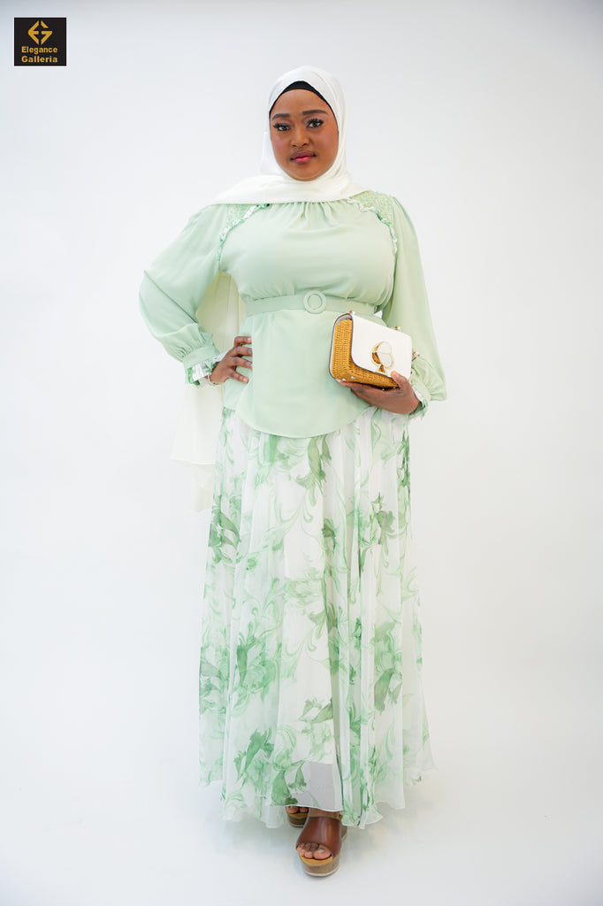 Elevate your wardrobe with our graceful 2-Piece Chiffon Set, designed for elegance and comfort. This flowy, modest ensemble features a fully lined chiffon blouse paired with a matching skirt, perfect for special occasions or sophisticated everyday wear. The top includes delicate beadwork on the shoulders for a refined touch of texture and elegance. A matching chiffon belt cinches the waist to enhance your silhouette while maintaining modesty and ease.